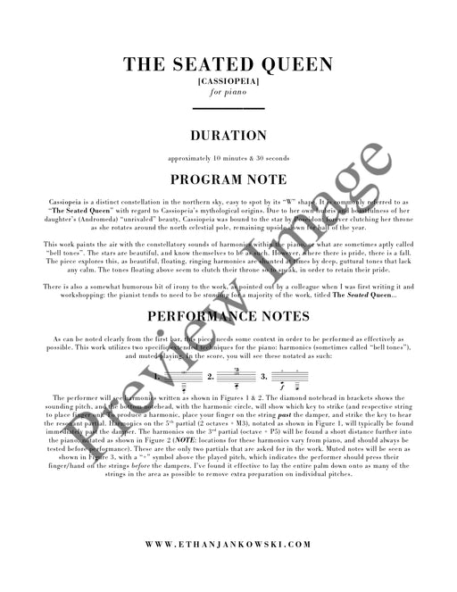 The Seated Queen (Cassiopeia)by Ethan Jankowski For Piano, Advanced, 5 Pages Cassiopeia is a distinct constellation in the northern sky, easy to...